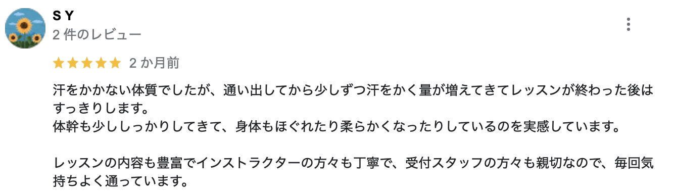 スタジオは体の柔軟性が格段に高くなる暖かい環境になっています。そのおかげで体は芯から温まり、大量の汗をかくことで代謝がアップ!ダイエット、冷え性改善、むくみや肩こり、便秘の解消など、様々な嬉しい効果を期待できます。